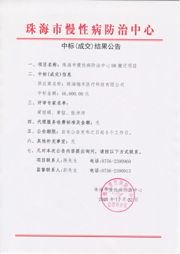 珠海市慢性病防治中心DR搬迁项目中标(成交)结果公告
