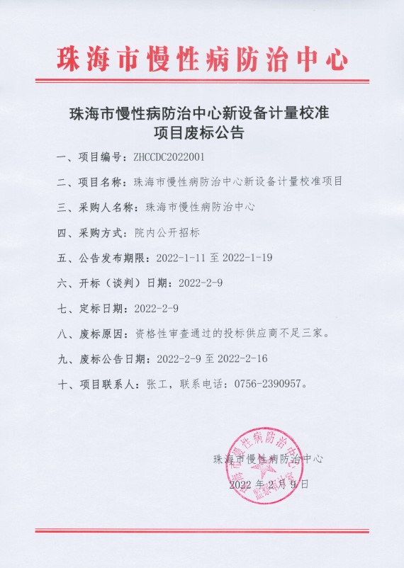 珠海市慢性病防治中心新设备计量校准项目废标公告