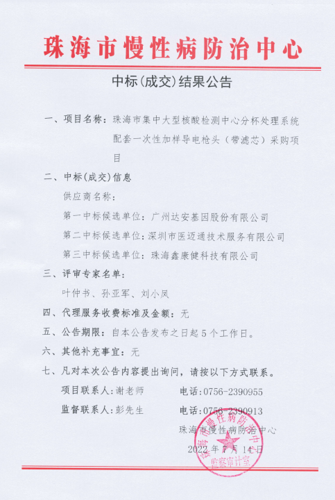 珠海市慢性病防治中心微生物检验仪采购项目中标结果公告