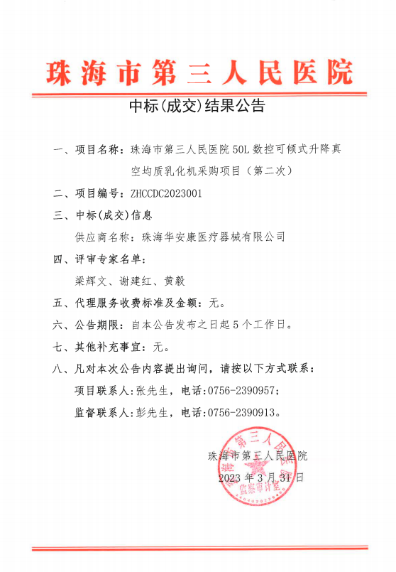 H次元 50L数控可倾式升降真空均质乳化机采购项目(第二次)中标(成交)结果公告