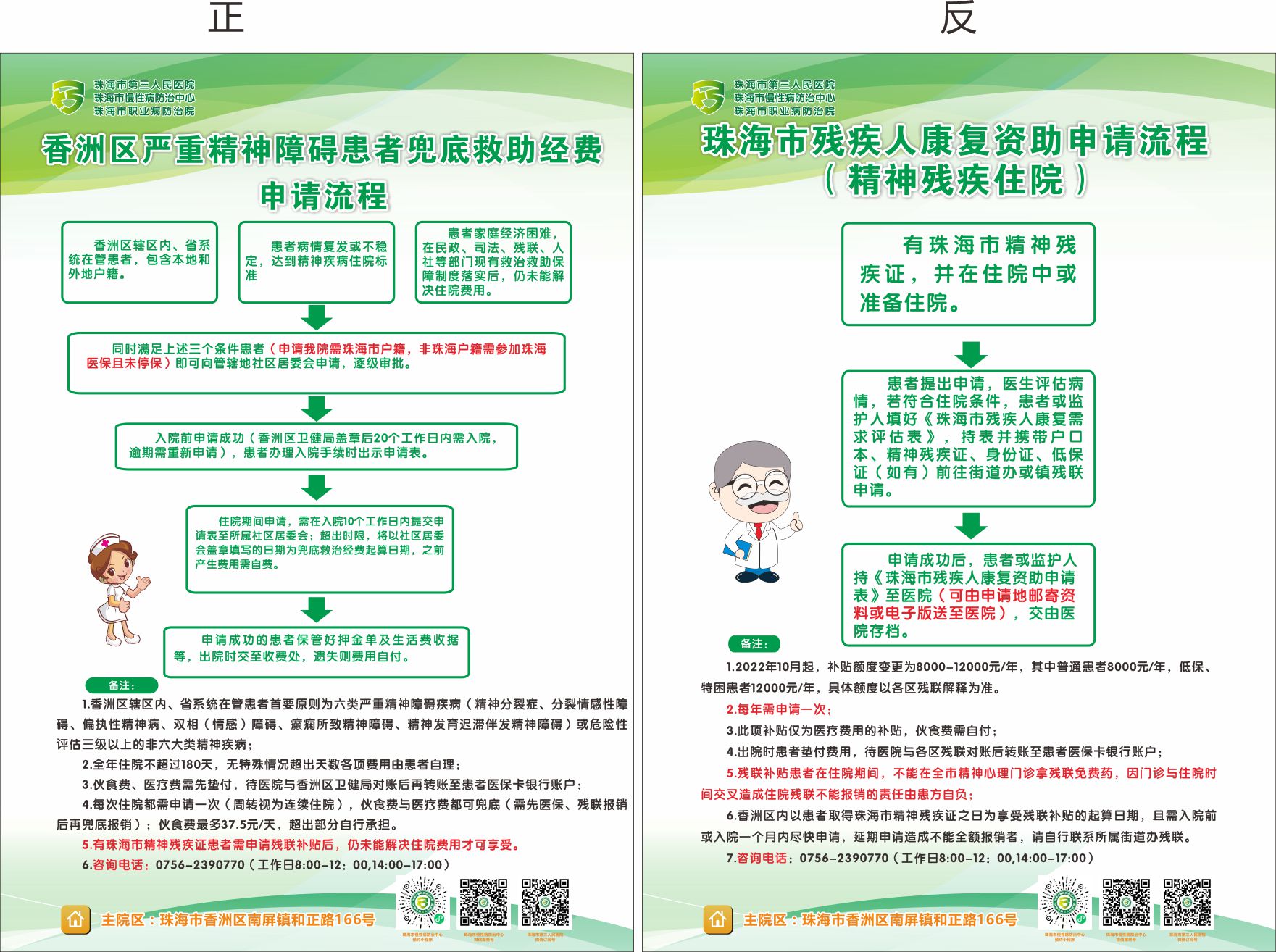 (二)申请流程:患者提出申请,医生评估病情,若符合住院条件,填好《珠海市残疾人康复需求及效果评估表》,患者持表并携带户口本、精神残疾证、身份证、低保证前往街道办或镇残联进行申请。申请成功后,患者或监护人持《珠海市残疾人康复资助申请表》至H次元 (可由申请地邮寄资料或电子版发送H次元 ),交由H次元 存档。