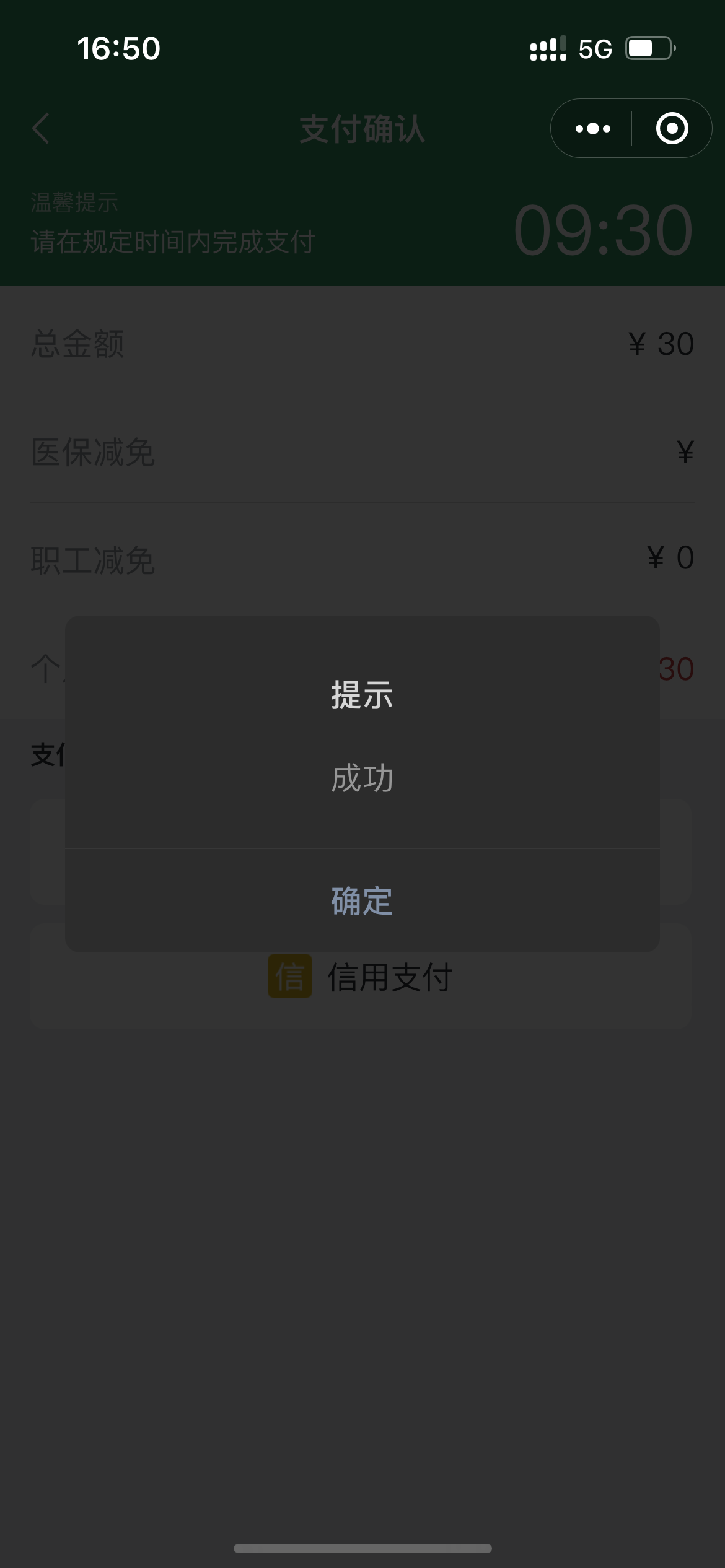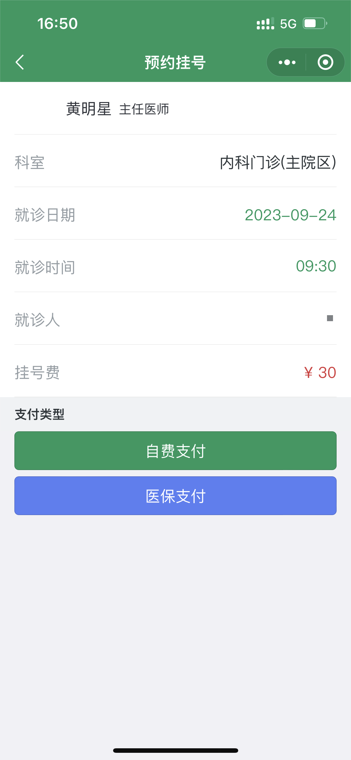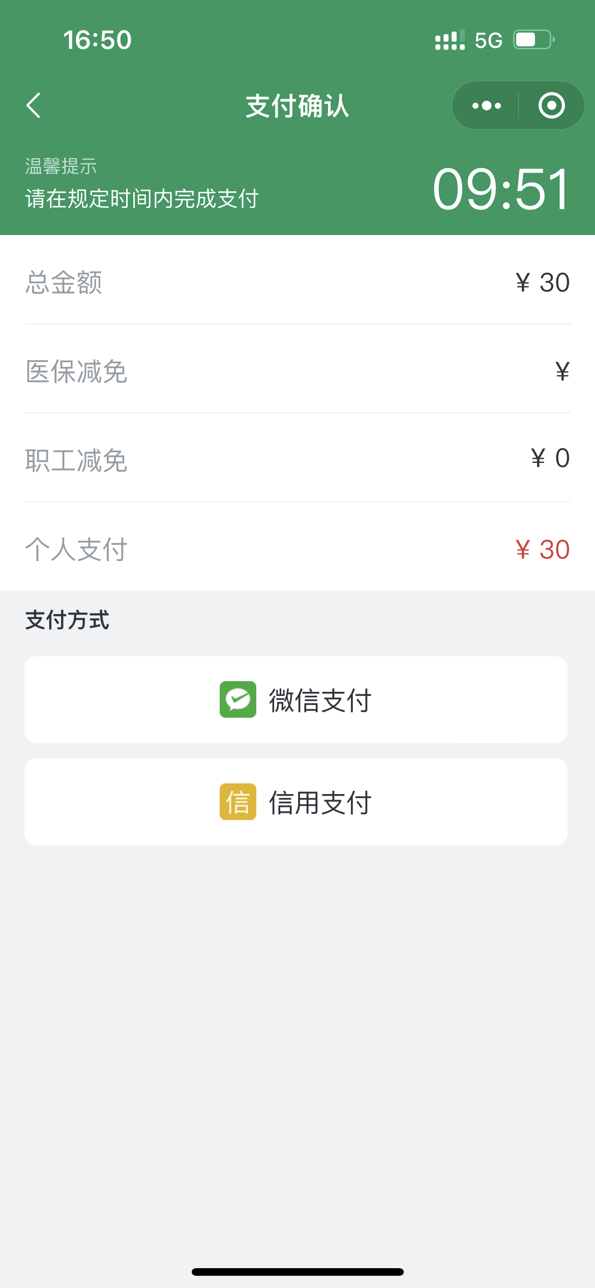 5.支付方式可选择自费支付中的微信或信用支付。若有我院H次元共济,可选择医保支付进行减免。