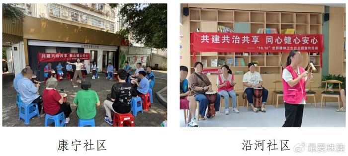 10月9日,在康宁和沿河两个社区开展鼓圈团体辅导活动,由我院资深心理康复治疗师作为引导者,带领一群人围坐成一个圆圈,每个人都持有不同的打击乐器,如鼓、沙锤、铃鼓等。通过集体演奏鼓乐,来体验团队合作、情绪表达和节奏协调的乐趣。