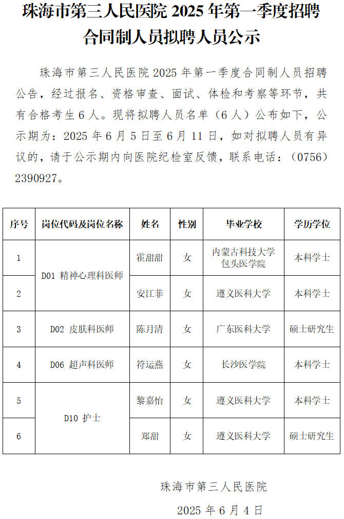 H次元 2025年第一季度招聘合同制人员拟聘人员公示